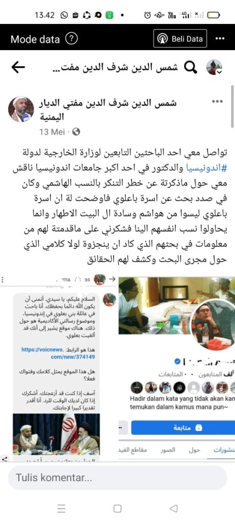 “Salah satu peneliti yang berafiliasi dengan Kementerian Luar Negeri Negara #Indonesia dan seorang doktor di salah satu universitas terbesar di Indonesia, menghubungi saya dan berdiskusi dengan saya apa yang saya sebutkan tentang bahayanya menyamarkan garis keturunan Bani Hasyim. Dan ia sedang dalam proses meneliti keluarga Ba’alawi. Maka saya menjelaskan kepadanya bahwa keluarga Ba’alawi bukanlah termasuk Bani Hasyim dan bukan “sadat ahli bait yang suci”. Mereka hanya mencoba untuk menghubungkan diri mereka dengan kami (sadat). Jadi dia berterima kasih kepada saya atas informasinya yang saya berikan kepada mereka (peneliti) tentang informasi-informasi penelitian mereka, yang hampir mereka selesaikan jika bukan karena pendapat saya yang mengubah arah penelitian dan mengungkapkan fakta kepada mereka.”