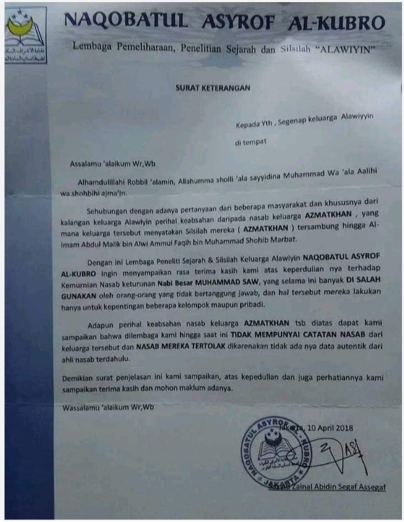 Sehubungan dengan adanya pertanyaan dari beberapa masyarakat dan khususnya dari kalangan keluarga Alawiyyin perihal keabsahan daripada nasab keluarga AZMATKHAN, yang mana keluarga tersebut menyatakan Silsilah mereka (AZMATKHAN) tersambung hingga Al-Imam Abdul Mallik bin Alwi Ammul Faqih bin Muhammad Shohib Mirbat.