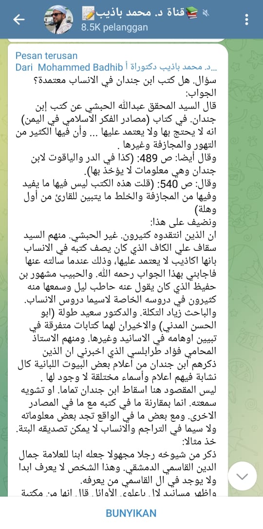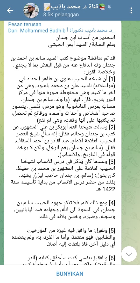 Dalam akun Telegramnya itu pula, Badzib memperlihatkan tulisan Aiman Al Habsyi tentang Salim Bin Jindan dengan judul: “Attahdir Min Ansab Ibni Jindan” (peringatan tenang nasab-nasab Ibni Jindan). Dalam tulisannya itu, Aiman diantaranya menyatakan bahwa ia bertanya kepada pamannya, Abu Bakar bin Ali al Masyhur, tentang kitab-kitab Ibnu Jindan, lalu pamannya menyatakan bahwa ia bertanya kepada Abdul Qadir Ahmad al Saqaf, maka ia berkata: “Salim bin Jindan orang baik, tetapi pendapatnya dalam nasab dan sejarah tidak boleh menjadi pegangan”.